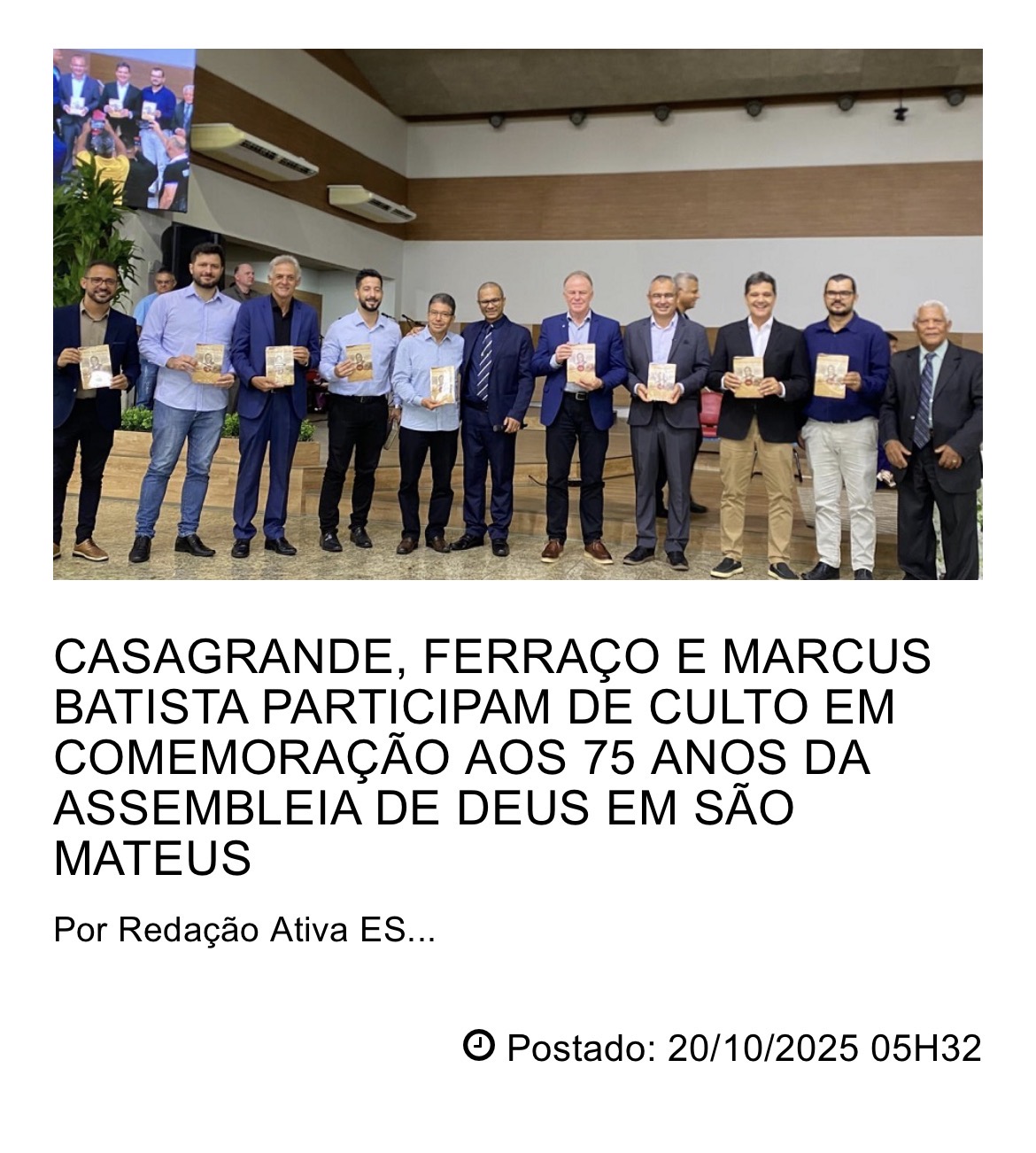 CASAGRANDE, FERRAÇO E MARCUS BATISTA PARTICIPAM DE CULTO EM COMEMORAÇÃO AOS 75 ANOS DA ASSEMBLEIA DE DEUS EM SÃO MATEUS