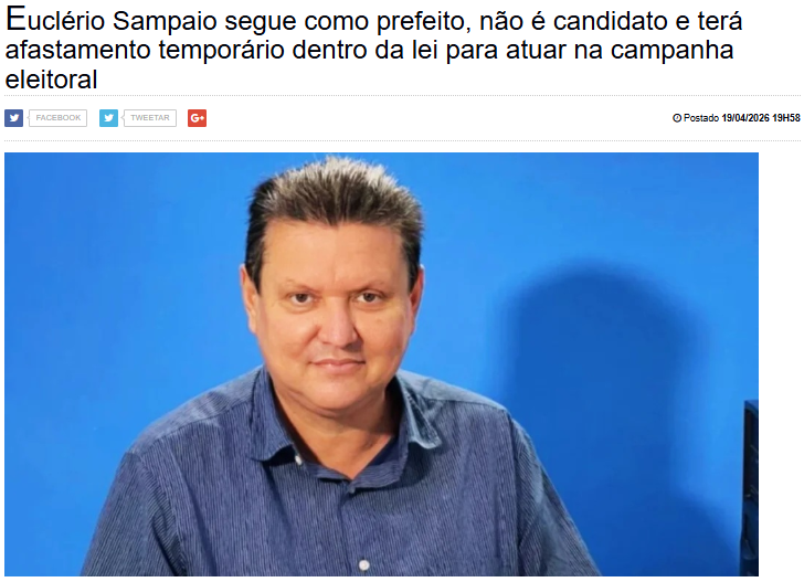 Euclério Sampaio segue como prefeito, não é candidato e terá afastamento temporário dentro da lei para atuar na campanha eleitoral