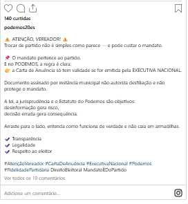 "Portanto, caso algum vereador tenha se desfiliado do partido que exija em seu estatuto a anuência da Executiva nacional, poderá ter seu mandato contestado pelo MP, partido ou suplente, em razão da desfiliação sem justa causa, invalidade da 'Carta de Anuência'", conclui o texto.