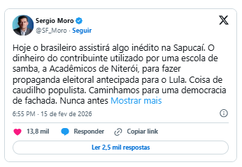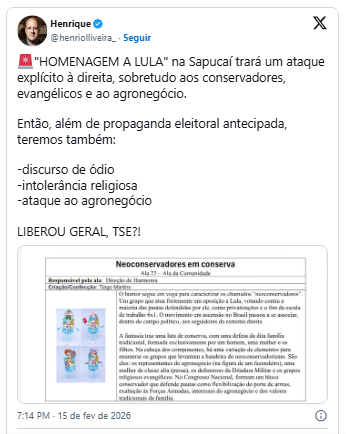 O desfile das escolas de samba do Grupo Especial começou neste domingo com a Acadêmicos de Niterói, atual campeã da Série Ouro. A escola apresentou um enredo que aborda a trajetória de Lula. Durante a semana, o plenário do Tribunal Superior Eleitoral rejeitou, por unanimidade, dois pedidos para impedir o desfile, sob a alegação de propaganda eleitoral antecipada. Os ministros entenderam que uma eventual proibição antes da apresentação configuraria censura prévia.