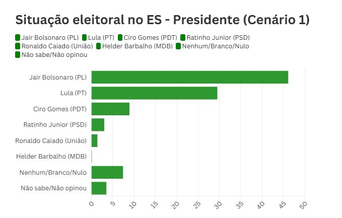 No primeiro cenário testado pela pesquisa, Bolsonaro tem 46,1% das intenções de voto, contra 29,5% de Lula. A seguir, surge o ex-presidenciável Ciro Gomes (PDT), com 8,9%. O governador do Paraná, Ratinho Junior (PSD), marca 3,0%; o de Goiás, Ronaldo Caiado (União), 1,4%; e o do Pará, Helder Barbalho (MDB), 0,1%.