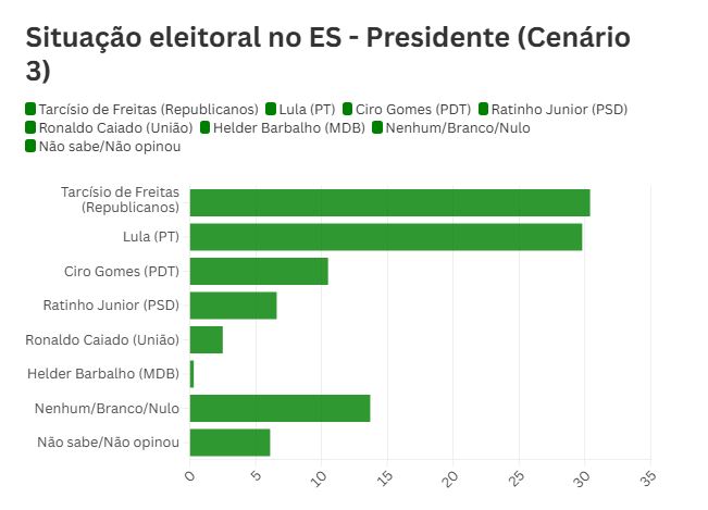 Ainda segundo o levantamento desta terça-feira, o governador de São Paulo, Tarcísio de Freitas (Republicanos), aparece empatado tecnicamente com Lula. Foram ouvidos 1.522 eleitores em 45 municípios capixabas entre os dias 28 e 31 de maio. A margem de erro é de 2,6 pontos percentuais, para mais ou para menos. O índice de confiança é de 95%.