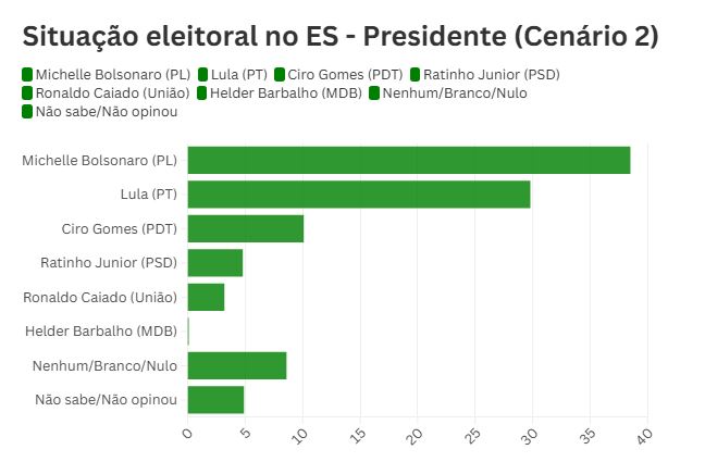 O ex-presidente Jair Bolsonaro (PL) e a ex-primeira-dama Michelle Bolsonaro (PL) superam o presidente Luiz Inácio Lula da Silva (PT) no Espírito Santo, segundo em simulações eleitorais testadas pelo instituto Paraná Pesquisas em levantamento divulgado nesta segunda-feira (13).