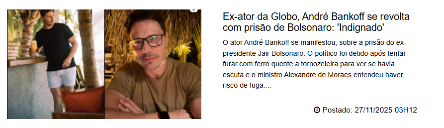 O ator André Bankoff se manifestou, sobre a prisão do ex-presidente Jair Bolsonaro. O político foi detido após tentar furar com ferro quente a tornozeleira para ver se havia escuta e o ministro Alexandre de Moraes entendeu haver risco de fuga....
